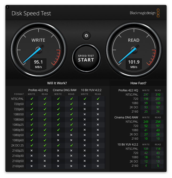 테스트는 blackmagic disk speed test라는 app으로 진행하였다.